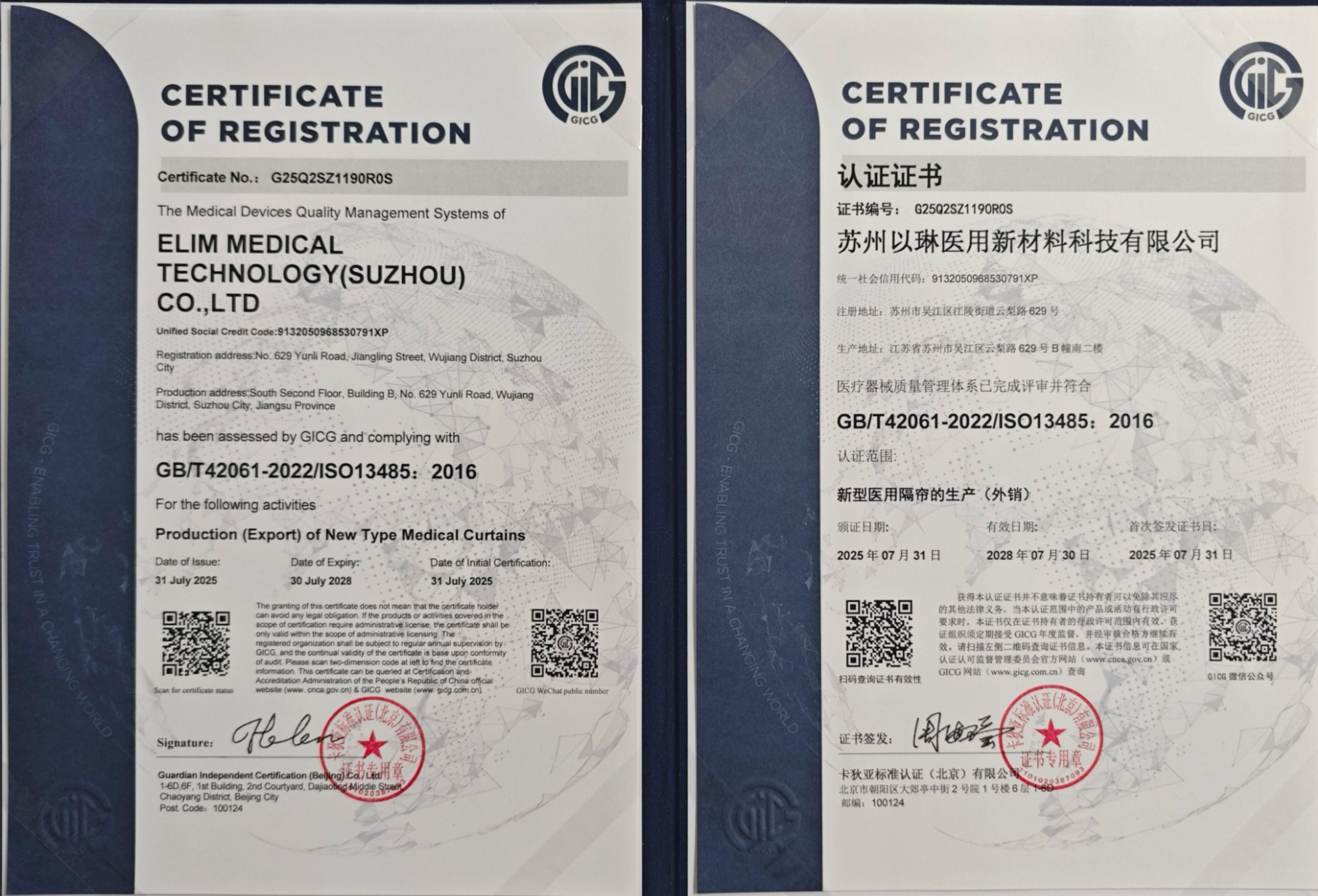 การรับรองโดยเฉพาะครอบคลุมการผลิตม่านทางการแพทย์ขั้นสูง (สำหรับการส่งออก) ซึ่งเป็นการตอกย้ำความเชี่ยวชาญของ Elim Medical ในการผลิตผลิตภัณฑ์ทางการแพทย์ที่มีคุณภาพสูงและเป็นไปตามมาตรฐานสำหรับตลาดโลก